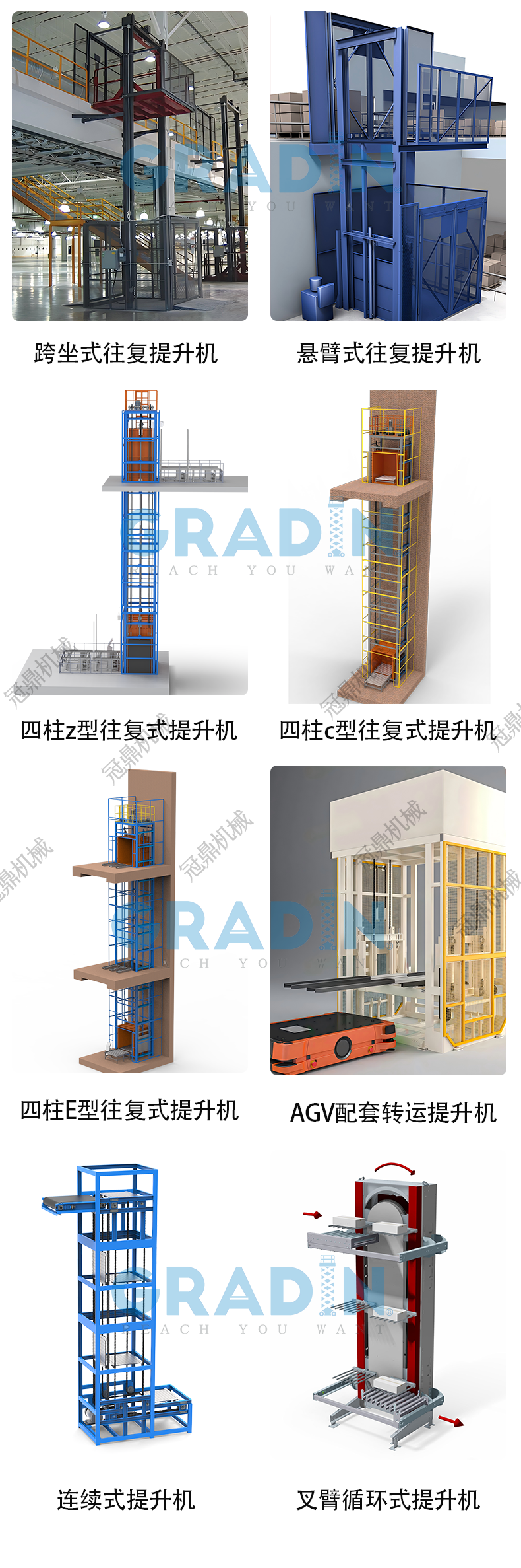 往復(fù)式提升機(jī)又可分為:跨坐式往復(fù)提升機(jī)、懸臂式往復(fù)式提升機(jī)、四柱z型往復(fù)式提升機(jī)、四柱c型往復(fù)式提升機(jī)、四柱E型往復(fù)式提升機(jī)、AGV配套轉(zhuǎn)運(yùn)提升機(jī)。