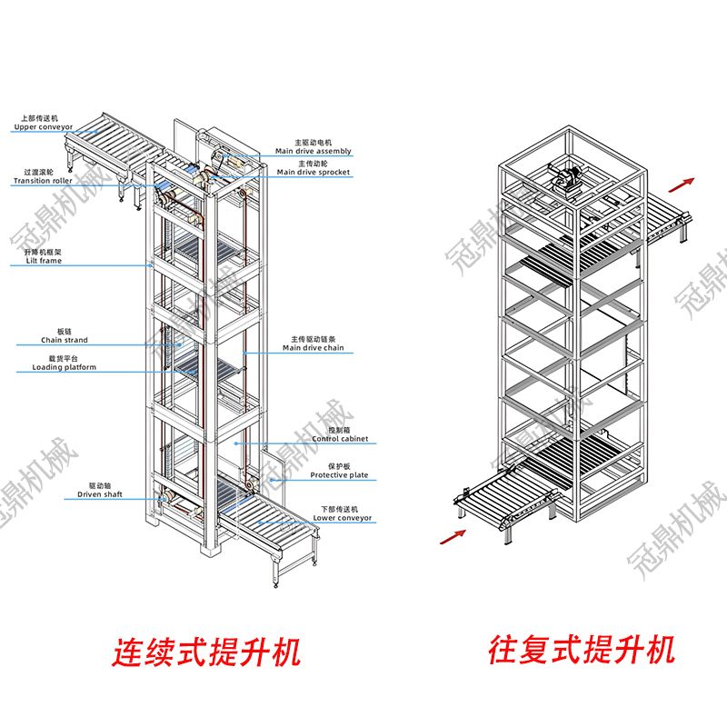 連續(xù)式提升機(jī):采用循環(huán)運(yùn)動(dòng)模式(如叉臂、斗式),貨物連續(xù)進(jìn)出,適用于高吞吐量場(chǎng)景。